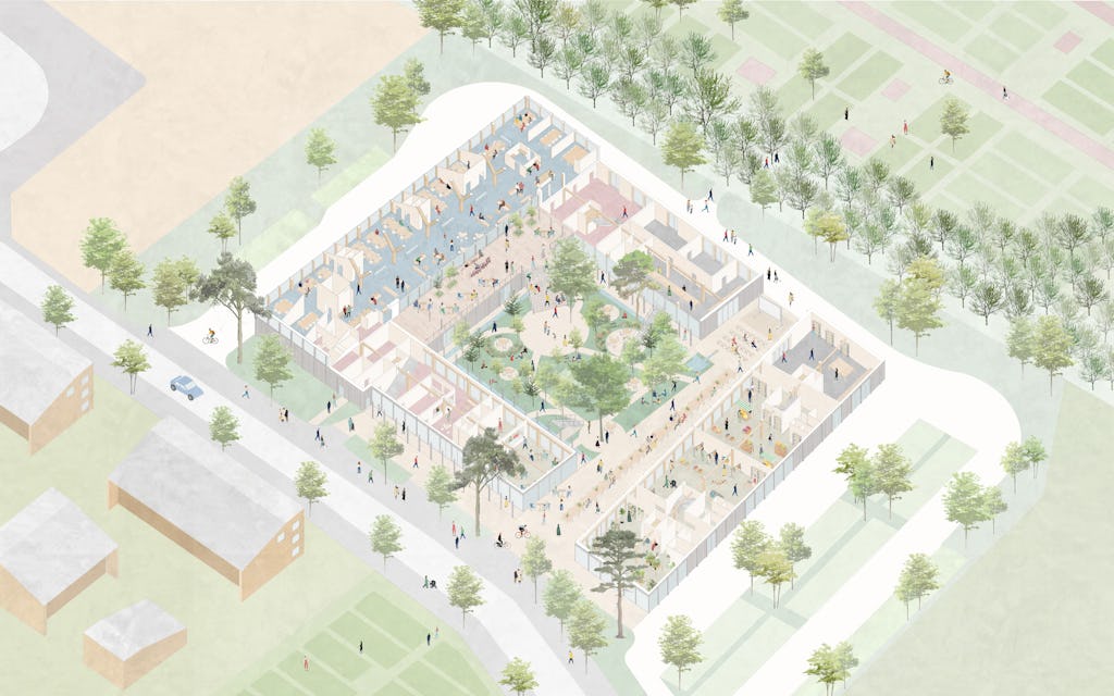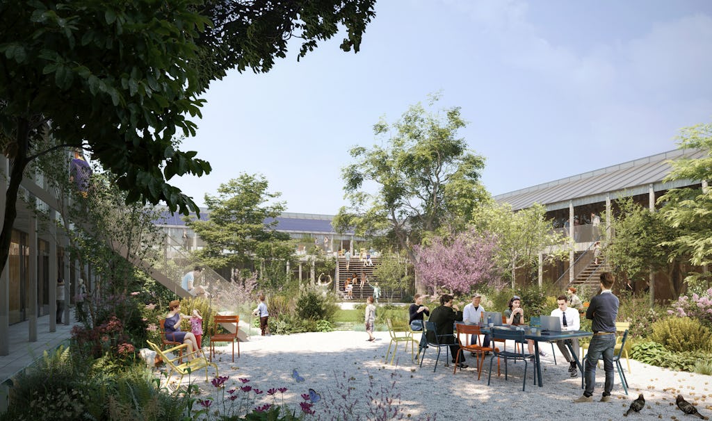Gården är en nod för alla delar av verksamheten och består av tre delar: Torgytan, Trädgården och Terrassen. Uthyrningsbara lokaler och kontor är placerade i en fristående länga i anslutning till gården. De tillfälliga bostäderna står i nära relation till både gården och gatan.