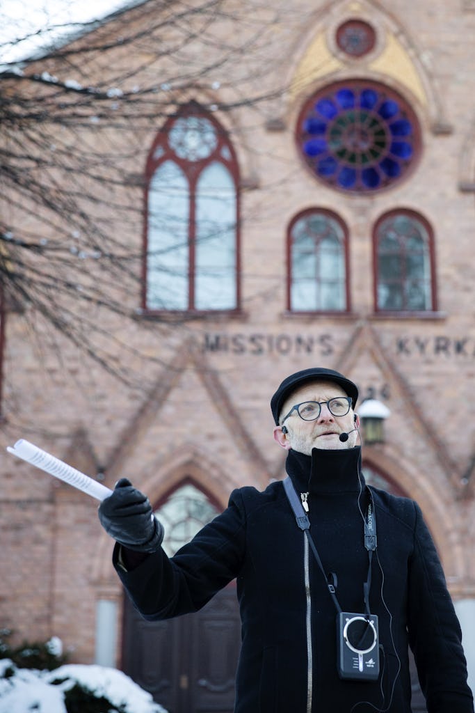 Tidigt på fredagsmorgonen den 9 januari står därför en udda skara samlad framför Borlänges bibliotek. Jacob Nordangård, iförd hög hatt, och Inger Glimmero Nordangård står tätt intill varandra, intill dem står ett par på några och tjugo – Elise Wiklund och Eric Norin. Till kvartetten hör även arkitekten Jerker Söderlind, iförd stadiga vandringskängor. De är här som representanter för Arkitekturupproret, för att gå på stadsvandring med Arne Ludvigsson som nu står bredbent på Sveatorget med en liten högtalare hängande över bröstet. Snön ligger kompakt över trottoarerna och gruppen på drygt 20 personer, med media och kommuntjänstemän, har torget för sig själva.